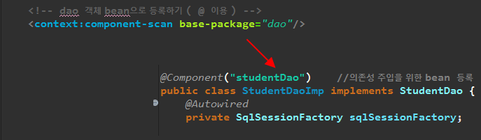 이미지1-2) DAO Class bean 등록 및 SqlSessionFactory 의존성 주입
