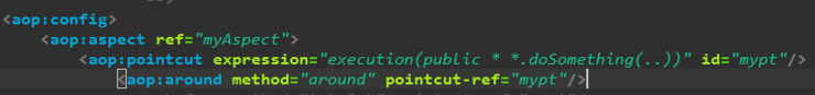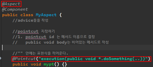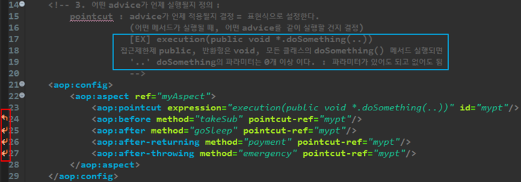 붉은색 체크박스 처럼, 각각 속성을 지정하면 속성에 맞는 화살표가 표기되어 진다. 이미지상에는 나와 있지 않지만, doSomething()을 포함한 bean에는 → 화살표가 추가되는데 이는 <aop:pointcut expression="execution(public void *.doSomething(..))"/> 코드에서 언급되어 있는 doSomething()를 1개 이상 포함하고 있다는 뜻이다.