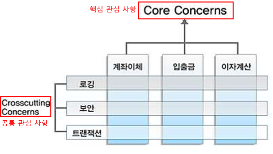 • 핵심관심사항 (Core Concers)코드 사이 사이에 들어가는 공통관심사항 코드