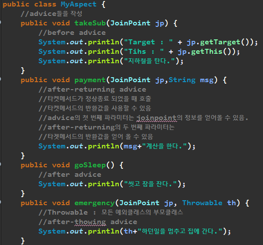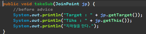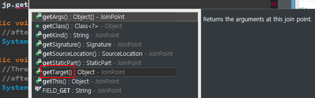 앞선 예제에서 JoinPoint(이하 jp)를 통해서 어떤 target이 작동했는지 알 수 있다.