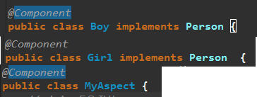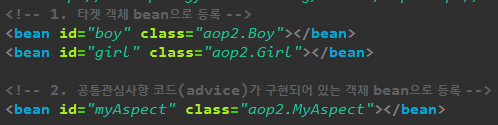 각각 사용 될 클래스 (Boy, Girl : 타켓메서드 / MyAspect : Aspect)를 @를 이용하여 bean으로 등록하였다. 그 이후 applicationContext.xml.xml에서 context:component-scan을 통해서 aop3 패키지에 annotation으로 등록된 클래스를 스캔할 수 있게 코드를 작성.