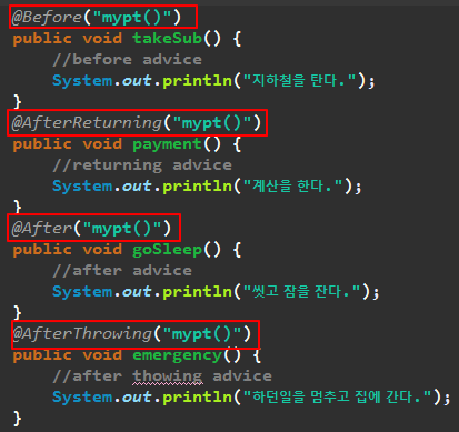 after-returning : 반환값이 참이라면 "돈을 입금했다", false라면 "돈을 입금하지 않았다" 라는 문구가 출력되게끔...