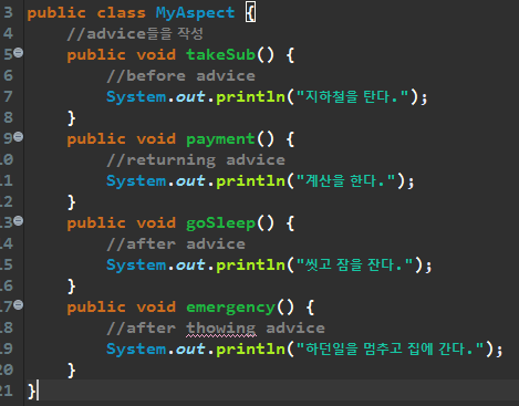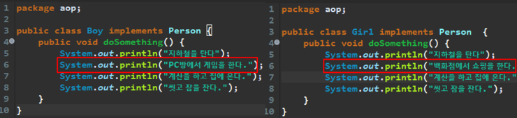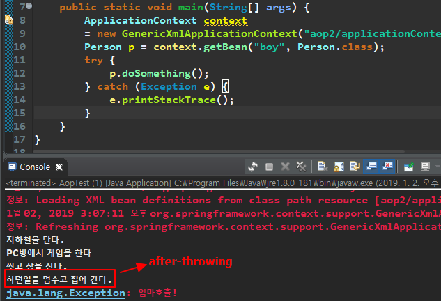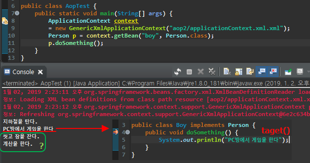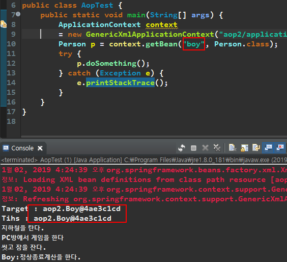 우리가 실질적으로 실행한 것은 단수하게 boy의 doSomething() 이지만, doSomething()에 적용된 AOP로 인해서 "PC방에서 게임을 한다" 외에 다른 메서드들이 (AOP에 적용시킨) 함께 동작하여, 콘솔창에 찍히는 것을 볼 수 있다.