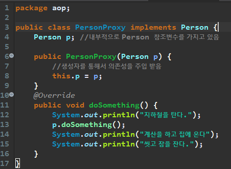 스프링 내부적으로 aop가 적용이 되면, Proxy 객체가 생성되는데, 이때 생성되는 Proxy 객체는 타켓(이미지상 Boy)의 부모 인터페이스(Person)을 구현하는 구현클래스(Proxy객체) 이다.