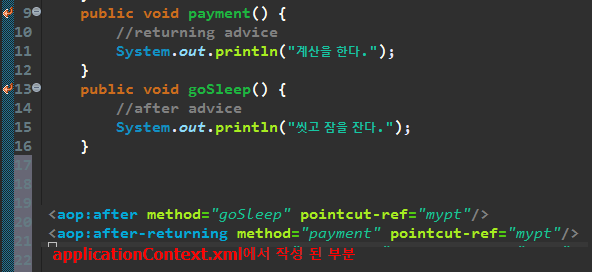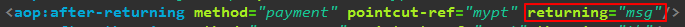 applicationContext.xml.xml에서 payment()를 설정한 부분에서 returning 이라는 속성을 추가하여, target 메서드(Boy)의 반환값을 payment()가 실행되면 msg라는 이름으로 전달하도록 설정했다.