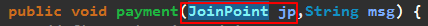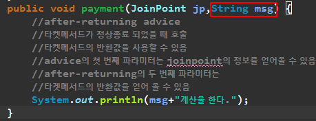 Aspect클래스의 advice() 중에서 after-returning에 해당하는 payment()에 파라미터를 통해서 msg를 받아오도록 작성하였다.