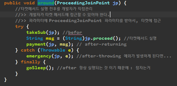 [around] : 타켓메서드 실행 전후를 개발자가 직접관리