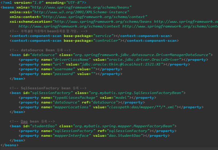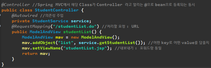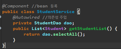@을 이용해서 bean으로 등록해주고, 스프링컨테이너에 bean으로 등록해두었던 StudentDao를 멤버변수 dao에 의존성 주입해준다. 그 다음, getStudentList()는 dao의 기능을 활용하여, StudentList를 반환한다.