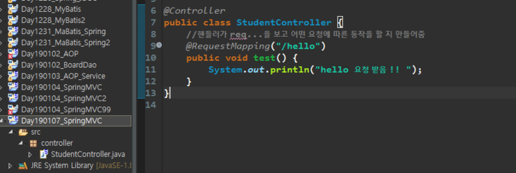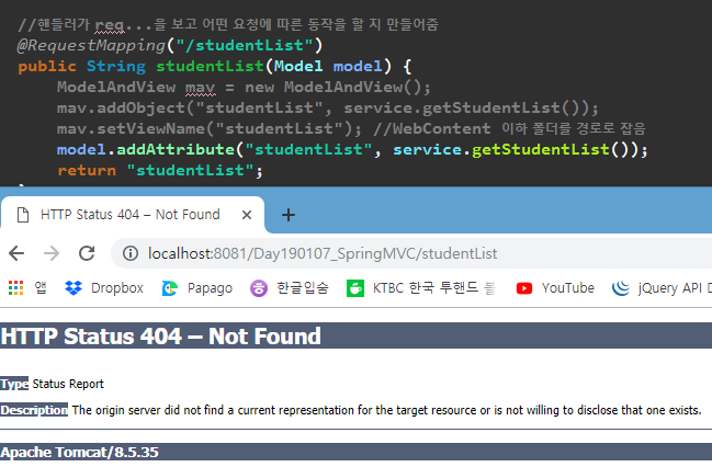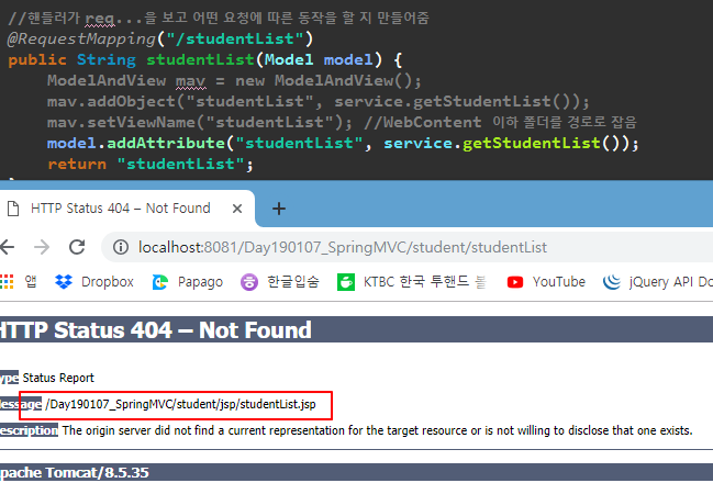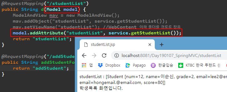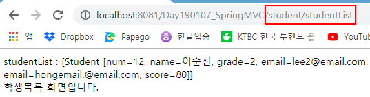 요청을 student/studentList로 한 모습 요청을 student/studentList로 한 모습
