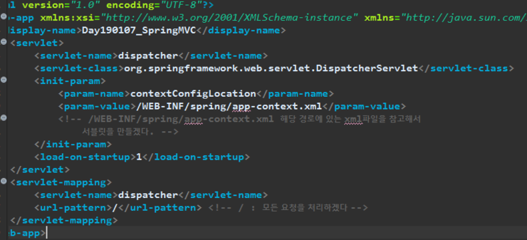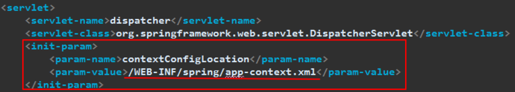 Dispatcher servlet은 서블릿의 역할과 스프링컨테이너 역할을 같이 하기 떄문에, 스프링 설정파일이 필요하며, 해당 파일의 경로를 <init-param>에 적어주게 된다.
