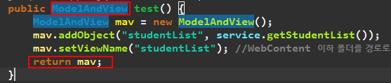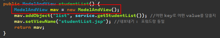 현재 컨트롤러에서 반환형으로 사용하고 있는 것은 ModelAndView 객체이다. ModelAndView 객체는 화면 정보와 데이터를 둘 다 포함하고 있는 객체이다.