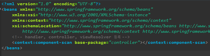 이때 handlermapping와 viewResolver은 스프링에서 지원해주는 기본 객체가 존재하기에 별도로 생성 할 필요가 없다. 단, controller (실제 로직수행)은 사용자가 따로 만들어서 bean으로 등록하고 사용하여야 한다.