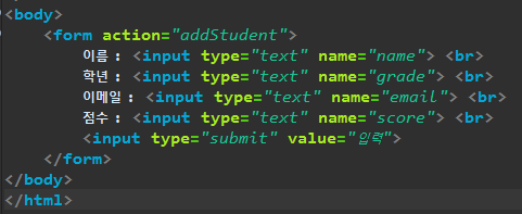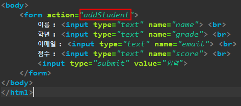 '입력' 이라는 버튼을 눌러서 form 요소의 submit 이벤트가 발생하게 되면 이미지상 빨간색으로 체크된 부분에 해당하는 값만 action 태그에 입력한 값으로 변경되기 때문에 form 요소에 앞 쪽에 있는 값 (/student)를 적지 않고 실질적인 요청 값만 적어주어도 된다.