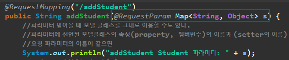 모델 클래스가 아닌 Map을 통해서도 앞선 예제처럼 값을 받아올 수 있다. 단, 이때는 Map 앞에 @RequestParam을 붙여주어야 한다.