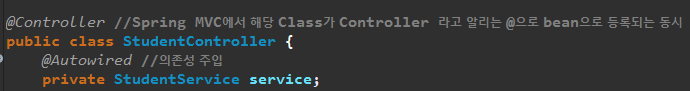 실제 로직 처리를 위해서 service 객체가 필요하고 bean으로 등록되어 있는 service 객체를 의존성 주입받아서 사용하게 된다.