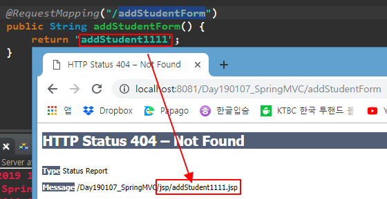 이미지에 보이는 것 처럼 return 값에 들어가는 반환값을 jsp 이름이 아닌 임의로 작성하여 오류를 발생 시키는 것으로 반환형이 String이면 해당 메서드는 viewName으로 간주된다는 것을 확인 할 수 있다.