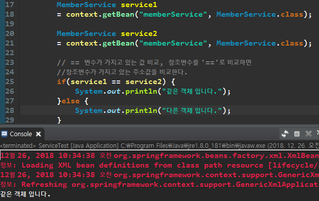 <scope="prototype"> 로 설정을 하게 되면, 다른 객체라는 문구가 콘솔창에 찍히게 된다.