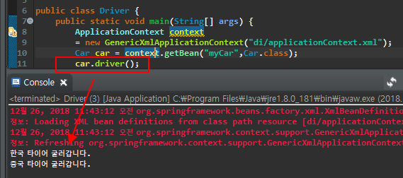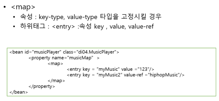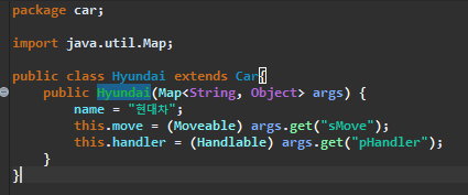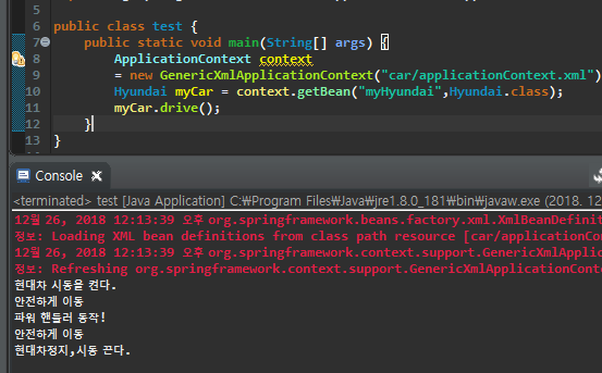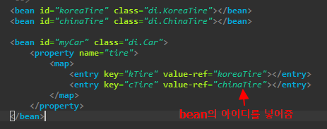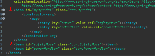 (1) Hyundai 클래스 bean 등록, 이때 생성자를 통한 등록을 위해서 <constructor-arg> 태그를 이용 하였으며, 생성자에서 파라미터로 받아오는 것이 Map 이기 떄문에 Map에 대한 key와 value-ref를 설정해주었다.