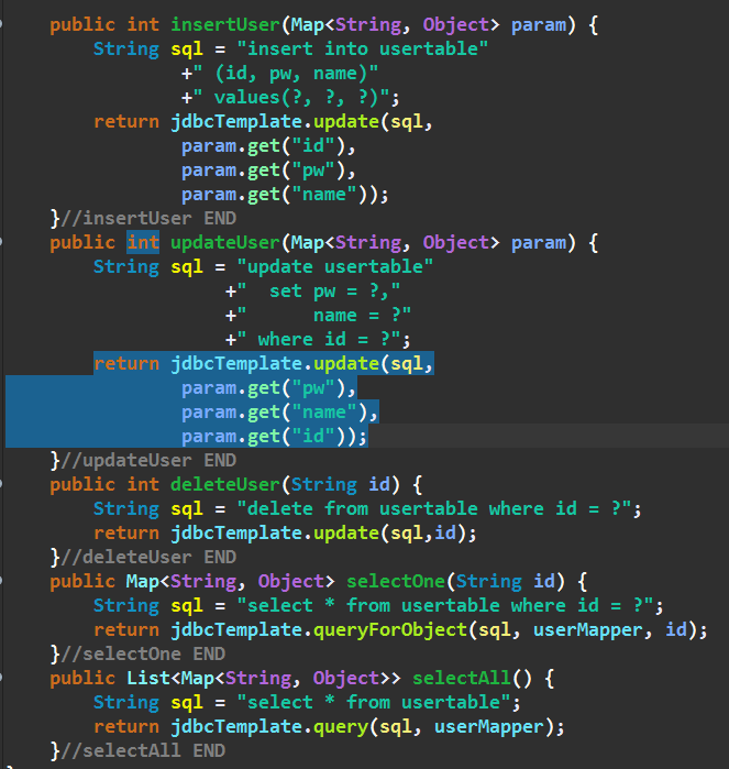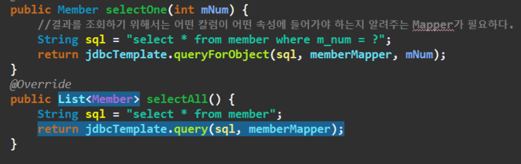 selectAll의 경우 RowMapper가 반활 할 값이 여러개 일 경우 알아서 List를 반환하기 때문에, 별도의 추가 작성 작성 할 필요가 없다.