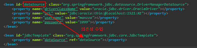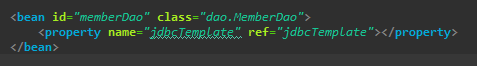 name에 적힌 것은 jdbcTemplate의 setter 이름이며, ref를 통해서 앞서 (이미지2)에서 만든 dataSource을 이용해서 의존성을 주입해준다.