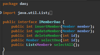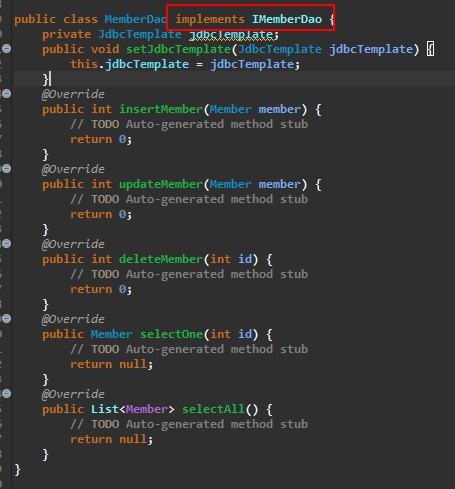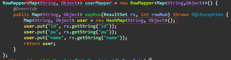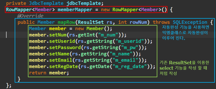 결과를 조회하기 위해서는 어떤 칼럼이 어떤 속성에 들어가야 하는지 알려주는 Mapper가 필요하다. 멤버변수로 선어하고 자동완성 기능을 사용하면 익명클래스 (인터페이스를 상속받는) 생성이 된다. 그 이후 내용과 리턴을 적절하게 작성해주면 된다.
