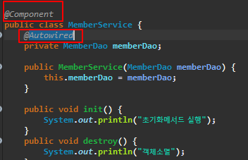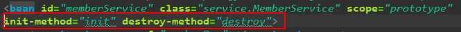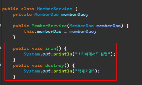 간단한 실습을 위해서, 단순하게 sysout으로 해당 메서드가 동작 하는지만 확인하기 위해서 간단하게 memberService 클래스에 이미지와 같이 각각 init과 destroy 메서드를 작성하였다.