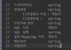 연결, 예외처리, 자원관리, sql 실행, 결과처리 등의 역할을 하는 객체를 bean으로 등록하는 모습이다.