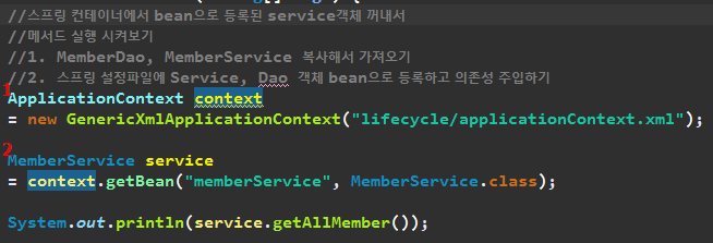(2) applicationContext.xml에 등록한 Bean(MemberService)을 가져오는 코드로, MemberService.class 라는 부분은 가져오고자 하는 bean의 타입을 적어주는 부분이다. 저 위치에 적지 않으면 앞 쪽에 형변환 식으로 적어주면 된다.